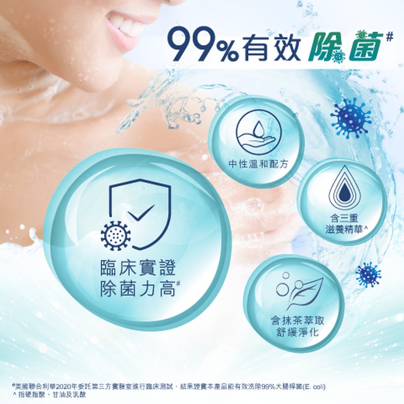 經實驗證明,有效溫和洗除細菌99%,配合中性配方,同時深層滋養呵護肌膚。