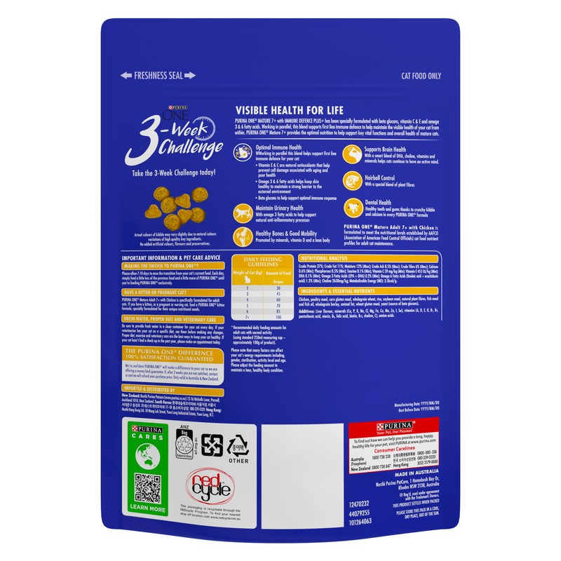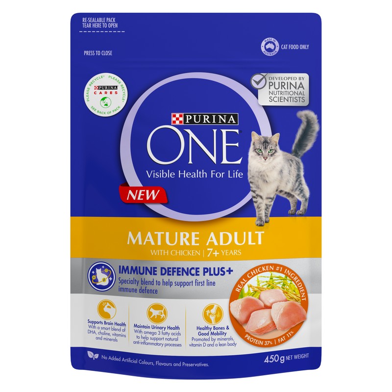 ONE 貓乾糧成貓7+配方 含有維生素C 和E、奧美加3 和6 以及β-葡聚醣,以協助您的貓由內到外擁有自然防禦。